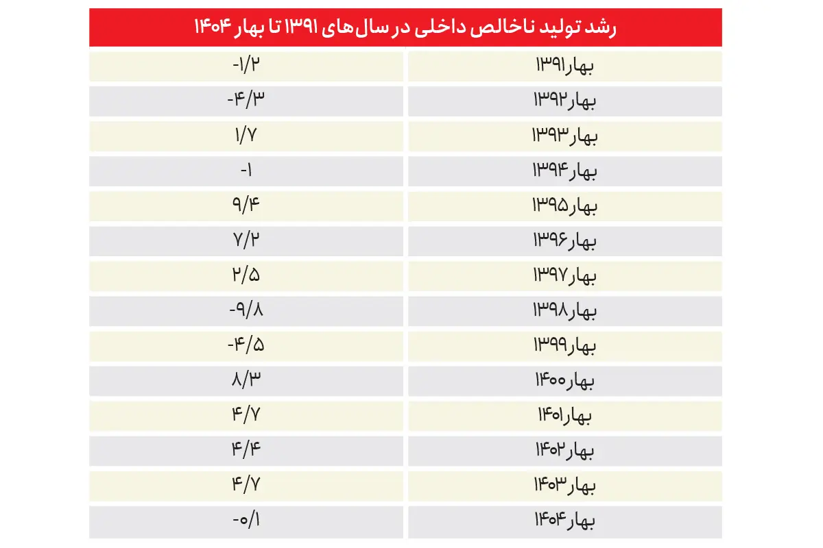 نرخ رشد تولید ناخالص داخلی در بهار ۱۴۰۰، 8/3 درصد و در بهار ۱۴۰۱، 4/7درصد، در بهار ۱۴۰۲، 4/4درصد و در بهار ۱۴۰۳، 4/7 درصد بود که در بهار امسال به منفی 0/1- درصد رسید. این روند یعنی کشور دوران رکود را طی میکند و شرایط اقتصادی کشور رو به افول است، این در حالی است که در برنامه هفتم توسعه که در دولت قبل تهیه و تصویب شد و مسعود پزشکیان خود را موظف به اجرای آن میداند، برای رشد ۸ درصدی هدفگذاری شده است که فعلاً در سال اول اجرا این رشد منفی است.