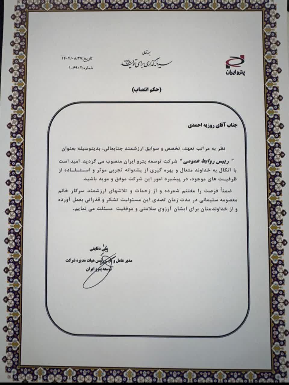 ‎در متن این حکم آمده است: «جناب آقای روزبه احمدی نظر به مراتب تعهد، تخصص و سوابق ارزشمند جنابعالی، بدین‌وسیله به‌عنوان رییس روابط عمومی شرکت توسعه پترو ایران منصوب می‌گردید.