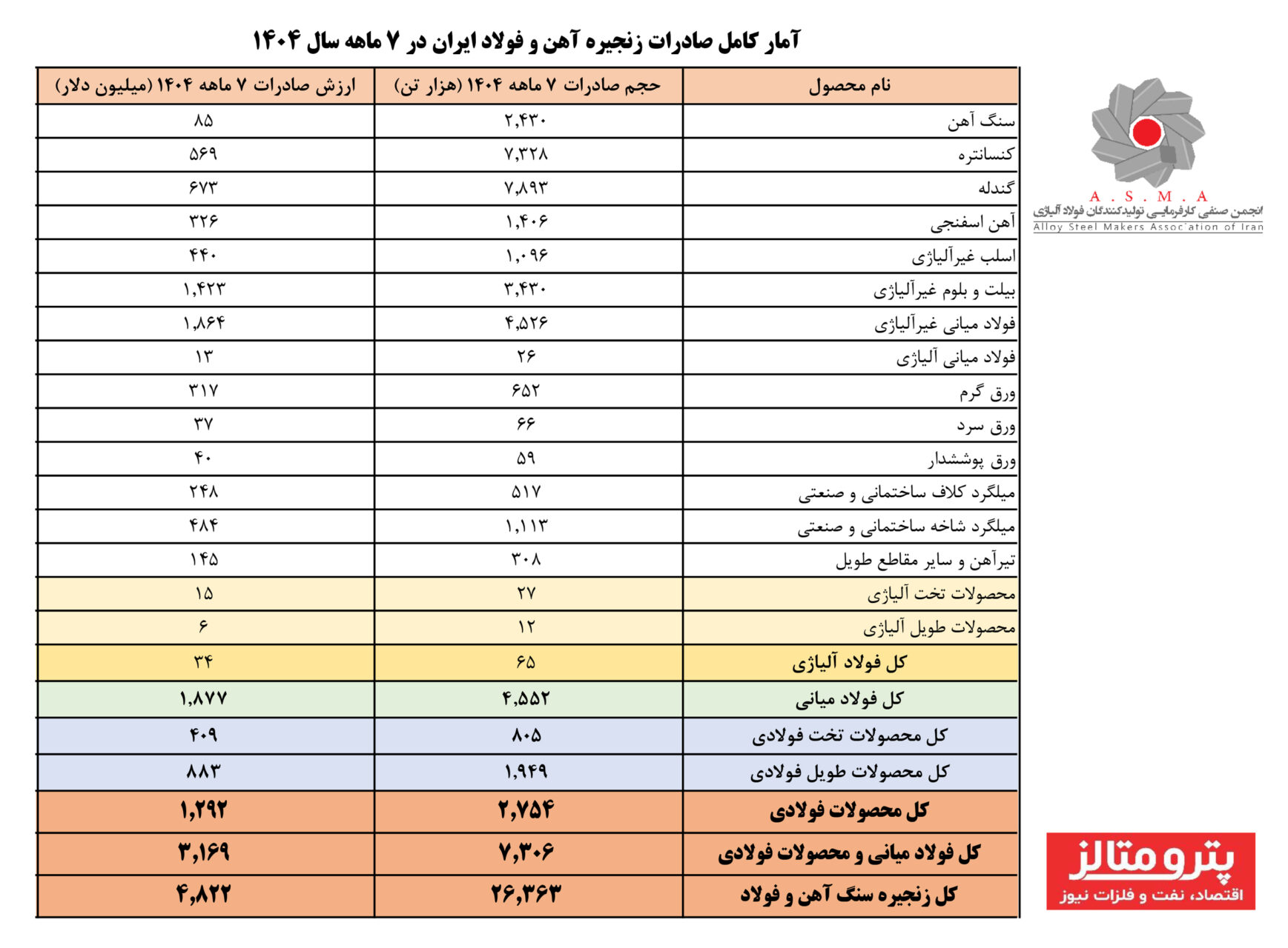 بر پایه گزارش آماری انجمن تولیدکنندگان فولاد آلیاژی، مجموع صادرات فولاد میانی و محصولات فولادی در هفتماهه نخست سال جاری به ۷٫۳۰۶ میلیون تن و ارزش ۳٫۱۶۹ میلیارد دلار رسیده است. در مجموع زنجیره، شامل مواد معدنی و محصولات فولادی، صادرات کل زنجیره آهن و فولاد ایران طی این دوره ۲۶٫۳۶۳ میلیون تن و ارزش ۴٫۸۲۲ میلیارد دلار ثبت شده است.