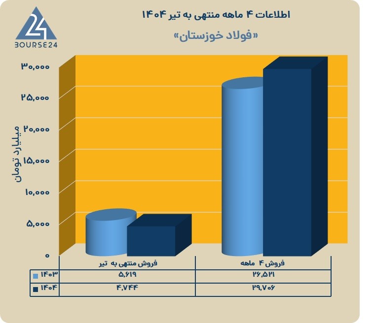 طبق اطلاعات ارائهشده، شرکت فولاد خوزستان طی چهار ماهه منتهی به تیر ماه ۱۴۰۴ موفق به ثبت درآمد ۲۹,۷۰۶ میلیارد تومانی از محل فروش محصولات و ارائه خدمات خود شده است.